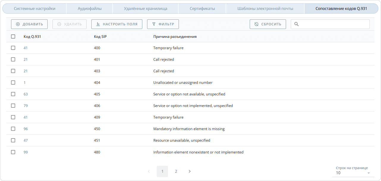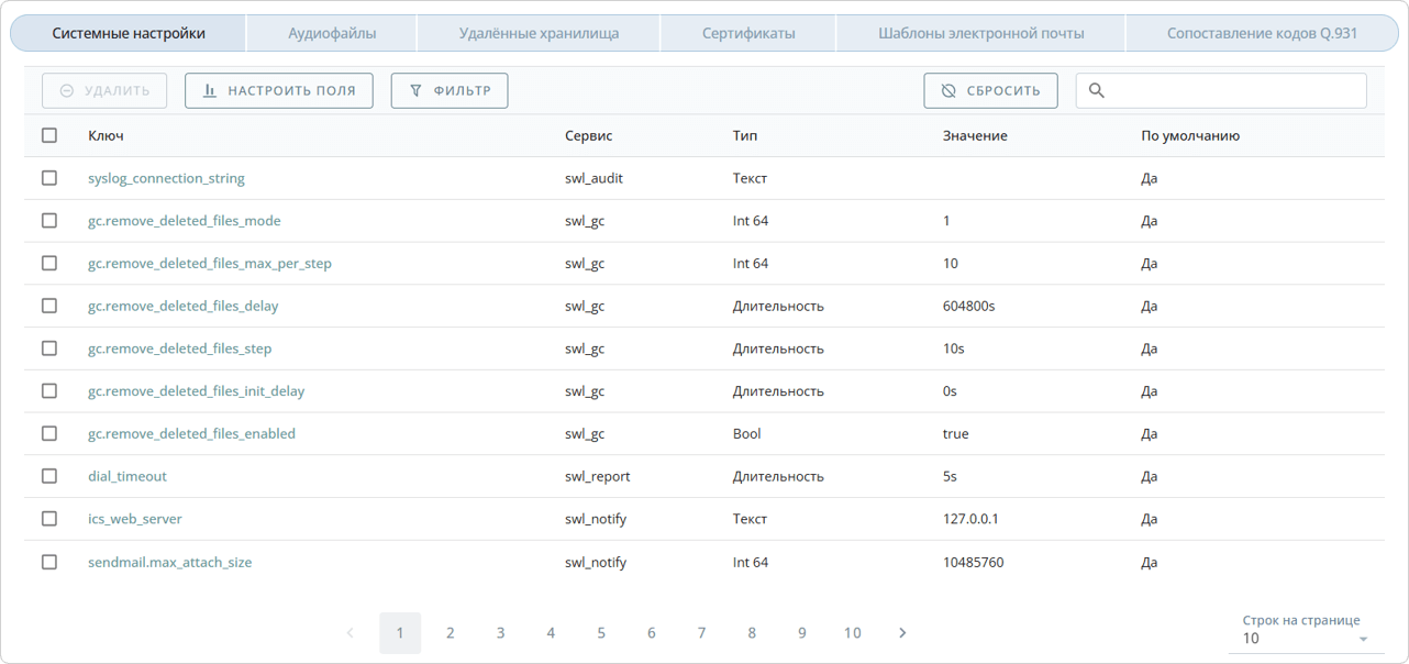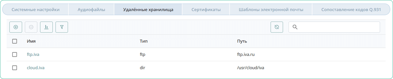 Во вкладке Удаленные хранилища отображаются все внешние хранилища, используемые в системе и предназначенные для выгрузки, хранения аудиофайлов и CDR.