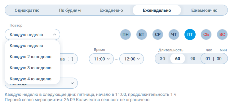 При создании / редактировании (доступно только при редактировании всех сеансов) периодического мероприятия можно указать дату его окончания: