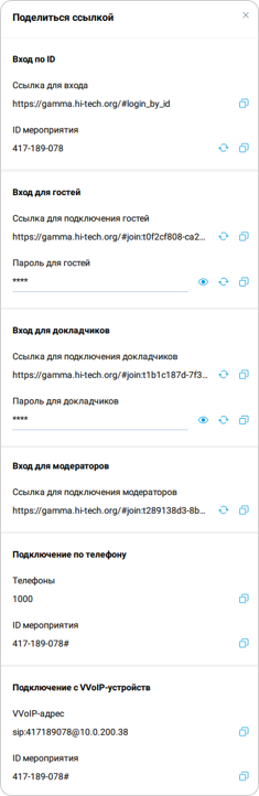 Организатор и Модератор мероприятия имеют возможность обновлять, копировать и отправлять ссылки для входа пользователей с различными ролями нового участника мероприятия, а также обновлять данные для подключения с различных устройств.