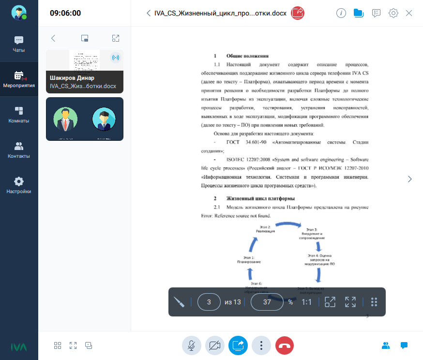 Участник мероприятия может начать демонстрацию файлов, содержащих текстовые документы, видео или изображения, загруженные или незагруженные в мероприятие.