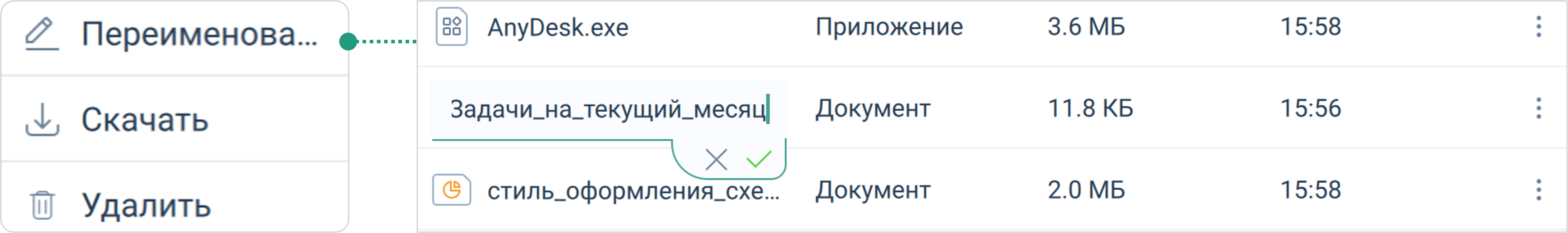Выбрать файлНажать кнопку Иконка Действия или Вызвать контекстное меню файлаВыбрать действие (переименовать, удалить, скачать)