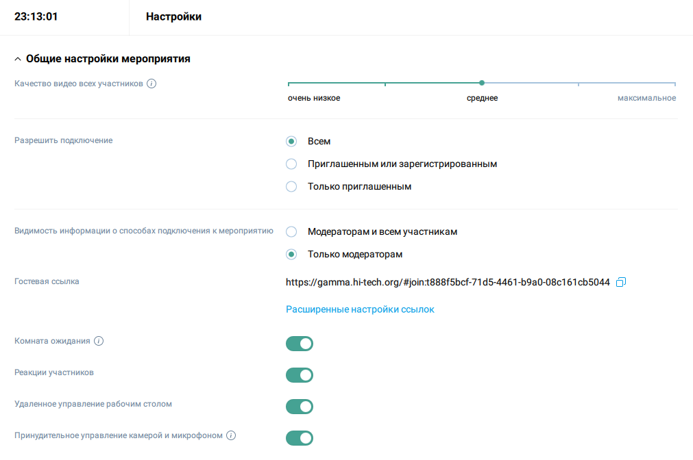 В разделе Настройки мероприятия Организатор и Модератор мероприятия имеют возможность изменить общие настройки мероприятия и права рядовых участников во время его проведения.