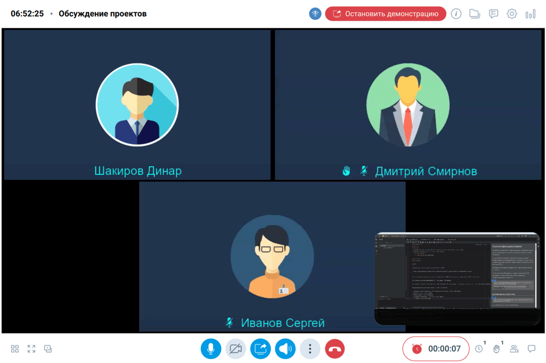 После начала демонстрации дополнительного контента область демонстрации отобразится в режиме Картинка в картинке, а в основной области будет отображено видео участника (-ов) мероприятия.