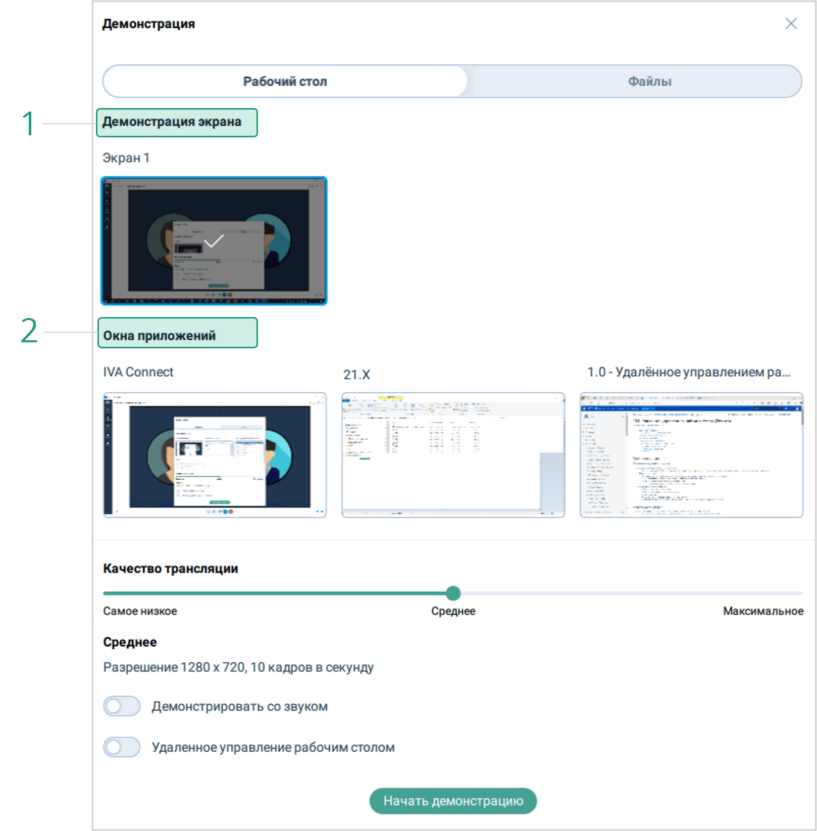 → Демонстрация → Рабочий стол → Выбрать вид демонстрации (демонстрация экрана, окна приложений) → Выбрать качество трансляции (низкое, среднее, максимальное) → Включить трансляцию звука системы (при необходимости) → Начать демонстрацию