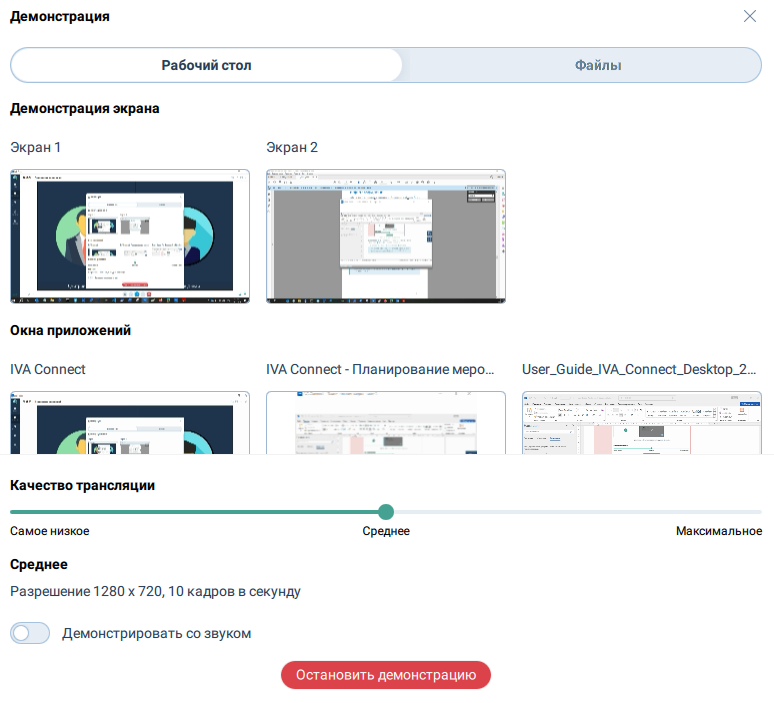 Значения параметров качества трансляции задаются Администратором Платформы IVA MCU. По умолчанию выставляется максимальное качество трансляции. Установленное пользователем значение параметра качества трансляции сохраняется для последующих демонстраций и восстанавливается на значение по умолчанию при перезапуске Приложения или смене аккаунта |