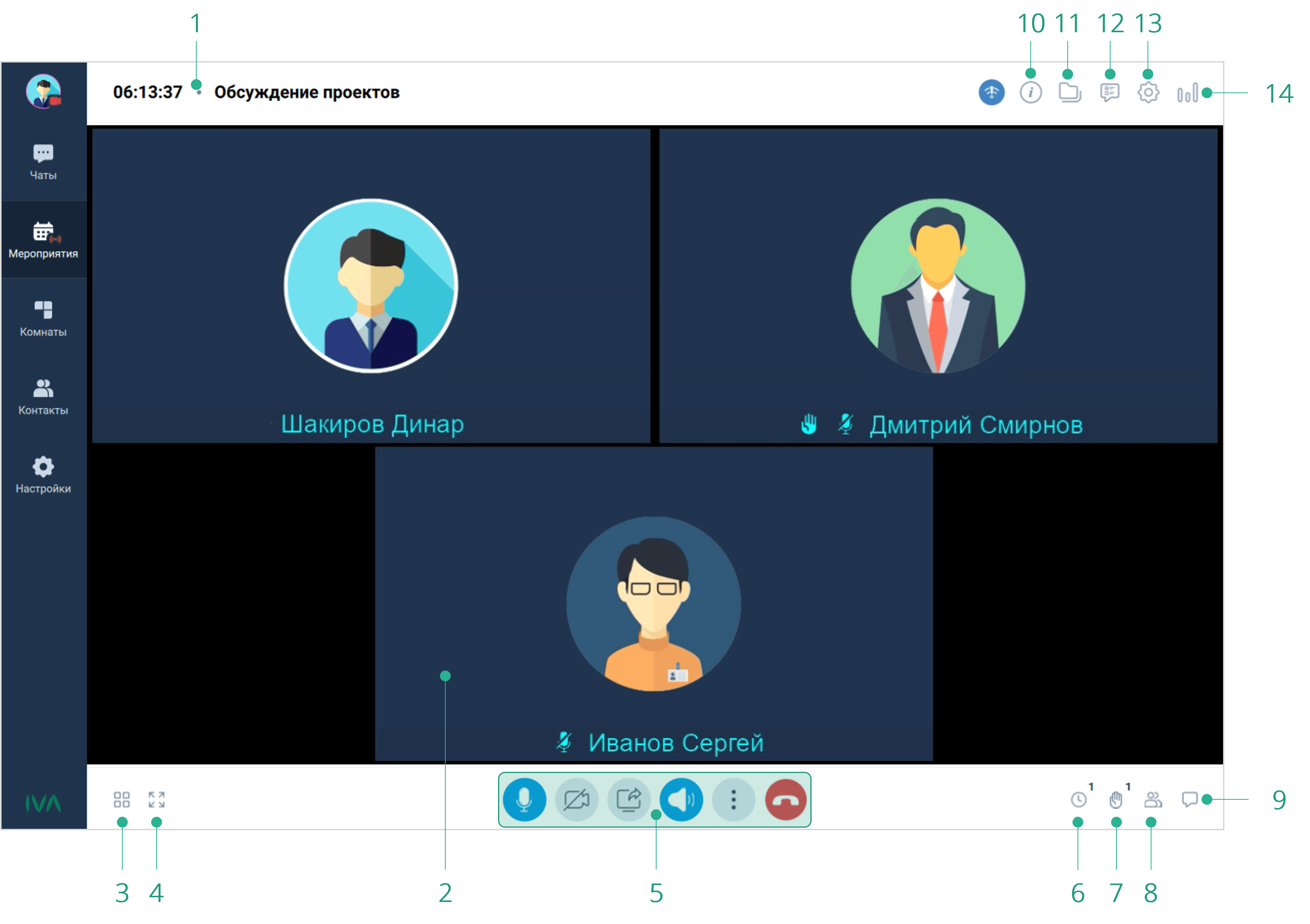 После подключения к мероприятию, пользователю отобразится интерфейс мероприятия, который предоставляет доступ к функциям и возможностям мероприятия: аудио- и видеотрансляция, демонстрация дополнительного контента, настройка оборудования, запись мероприятия, обмен файлами и т. д.