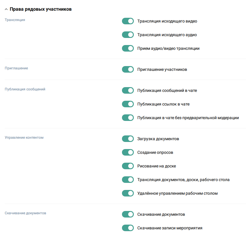 Организатор или Модератор мероприятия может дать или закрыть доступ рядовому участнику на следующие функции: