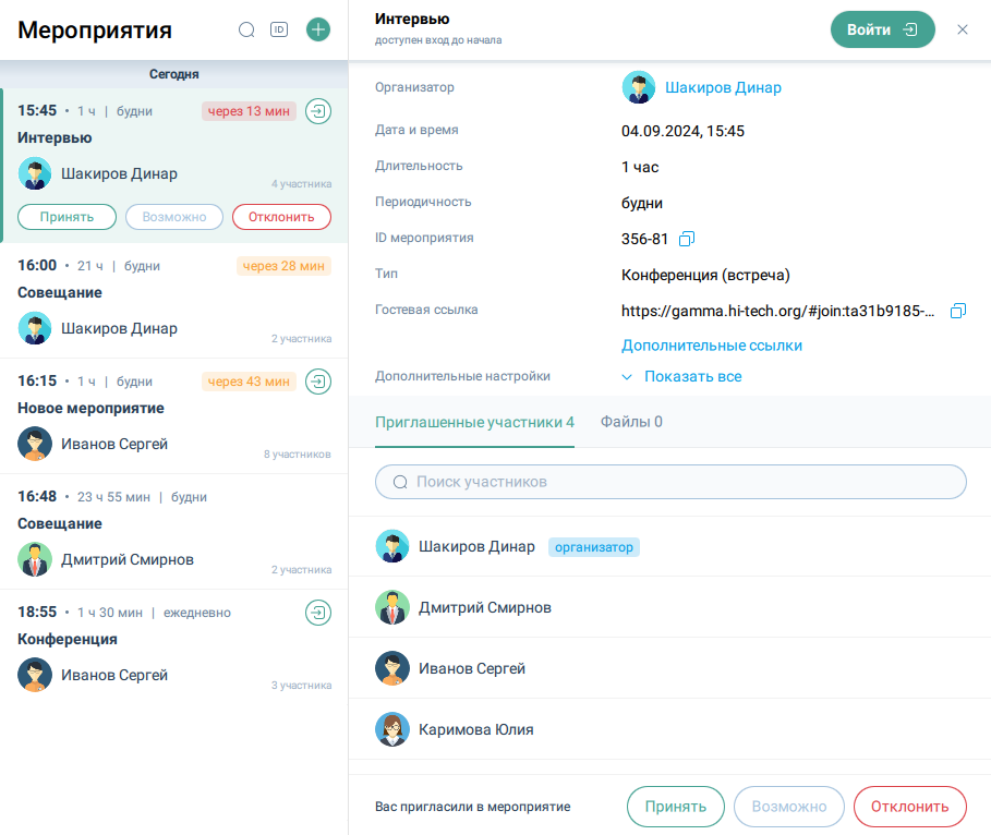 Если пользователя пригласили на запланированное мероприятие, то Приложение уведомит об этом в карточке мероприятия и области подробной информации, где необходимо принять решение: