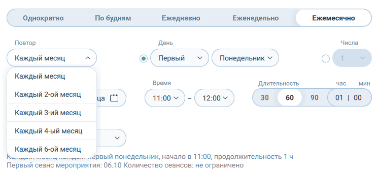 При создании / редактировании (доступно только при редактировании всех сеансов) периодического мероприятия можно указать дату его окончания: