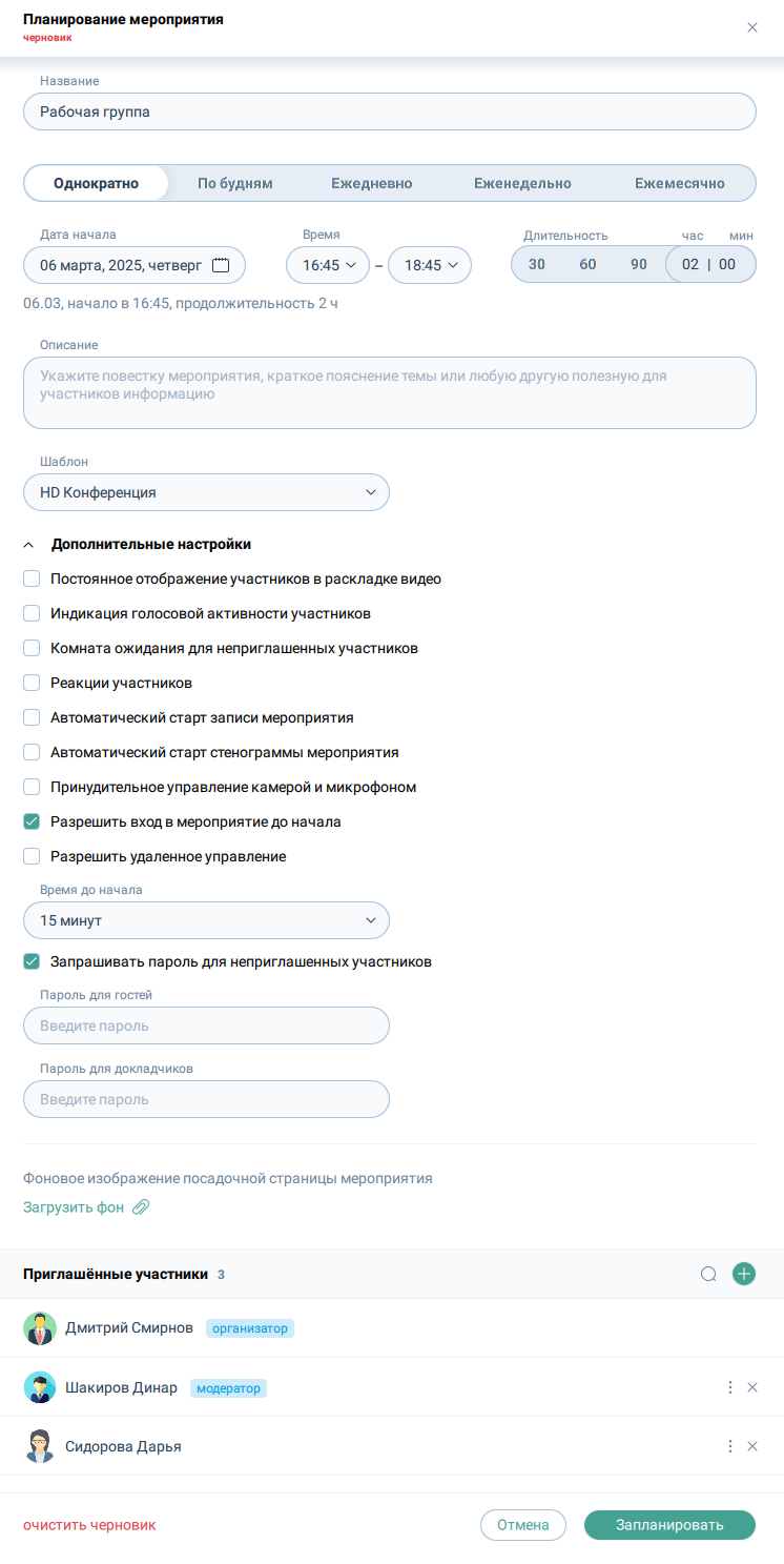 При создании планируемого мероприятия доступна дополнительная настройка — Запрашивать пароль для неприглашенных участников. После активации данной настройки при входе в мероприятие по ID или гостевой ссылке неприглашенным участникам необходимо будет ввести пароль.