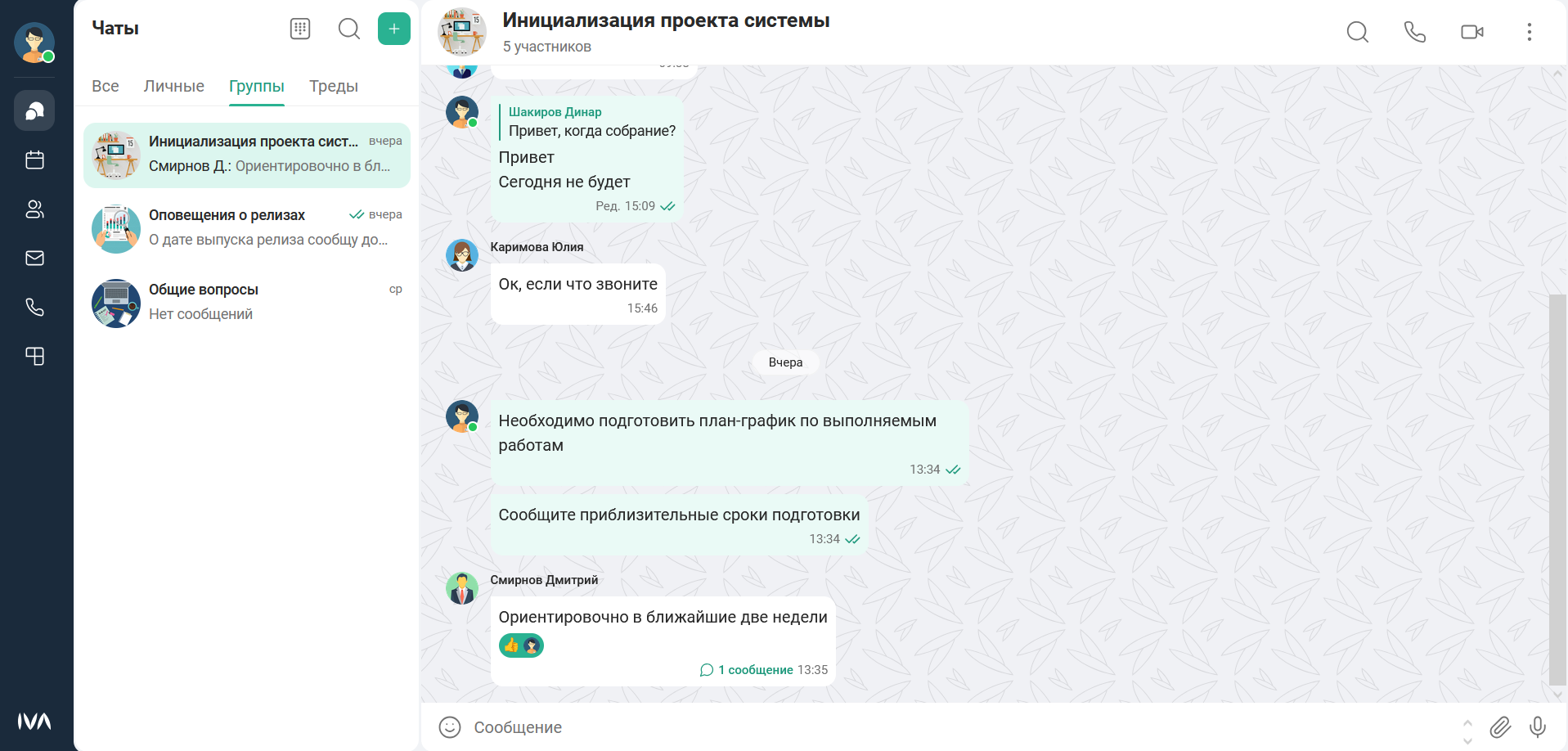 • треды — ветки обсуждения под сообщениями в групповых чатах и каналах. Треды могут быть созданы для любого сообщения в чате, кроме звонка, вложения или контакта. Треды может создавать и общаться внутри него, только участник родительского чата