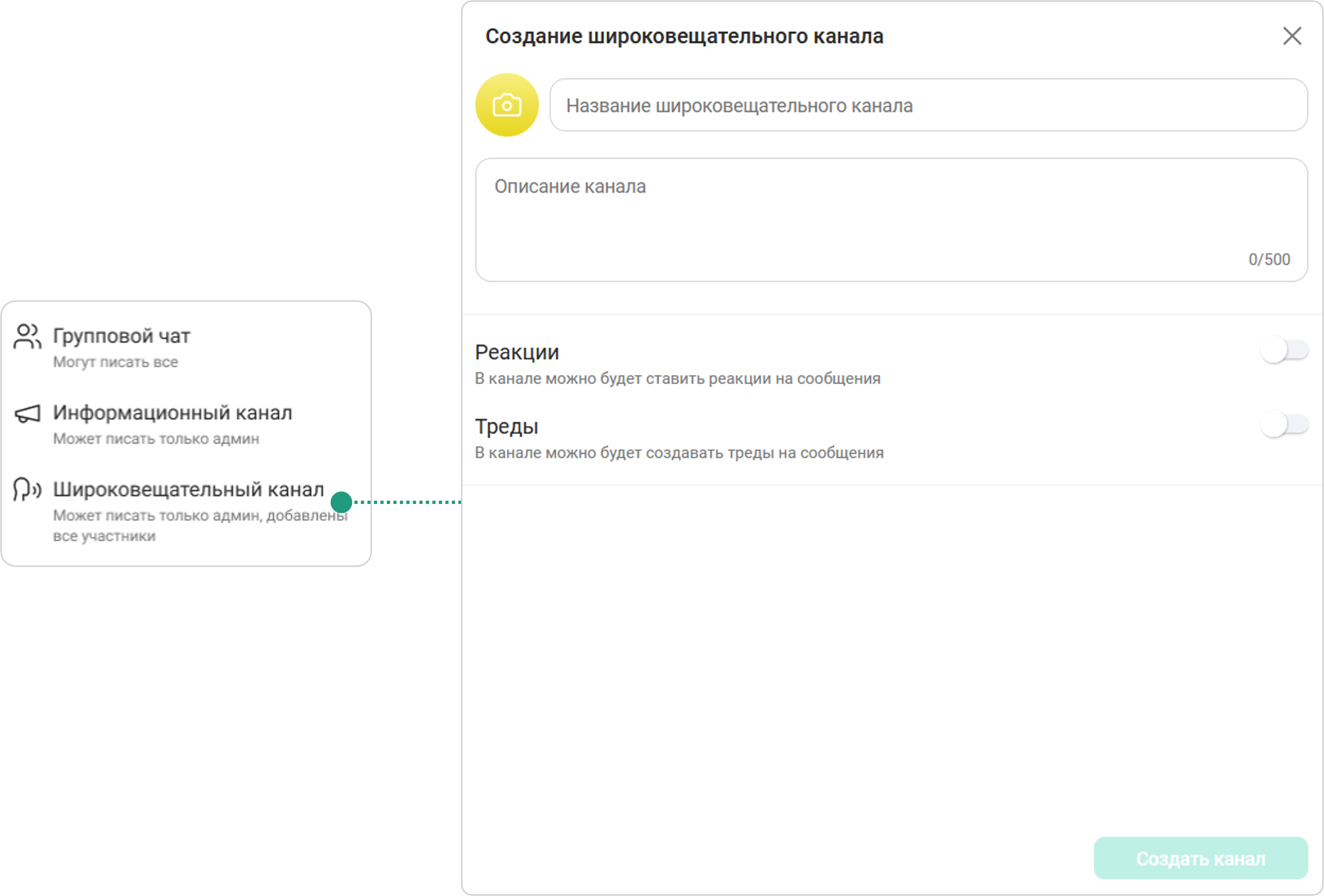 Чаты Иконка ЧатыНажать кнопку Иконка ДобавитьШироковещательный канал Иконка Широковещательный каналСоздание широковещательного каналаВвести название широковещательного каналаУстановить аватар канала (при необходимости) → Ввести описание канала (при необходимости) → Установить возможность оставлять реакции на сообщенияУстановить возможность создания тредовСоздать каналШироковещательный канал