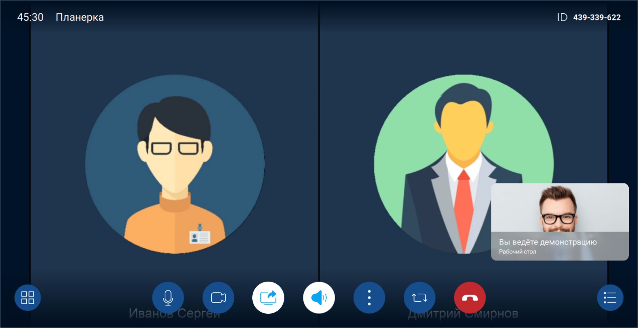 После начала демонстрации дополнительного контента область демонстрации отобразится в режиме Картинка в картинке, а в основной области будет отображено видео участников мероприятия