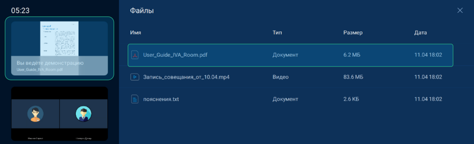 Участник мероприятия может начать демонстрацию файлов текстовых форматов и файлов с изображениями, загруженных в мероприятие.