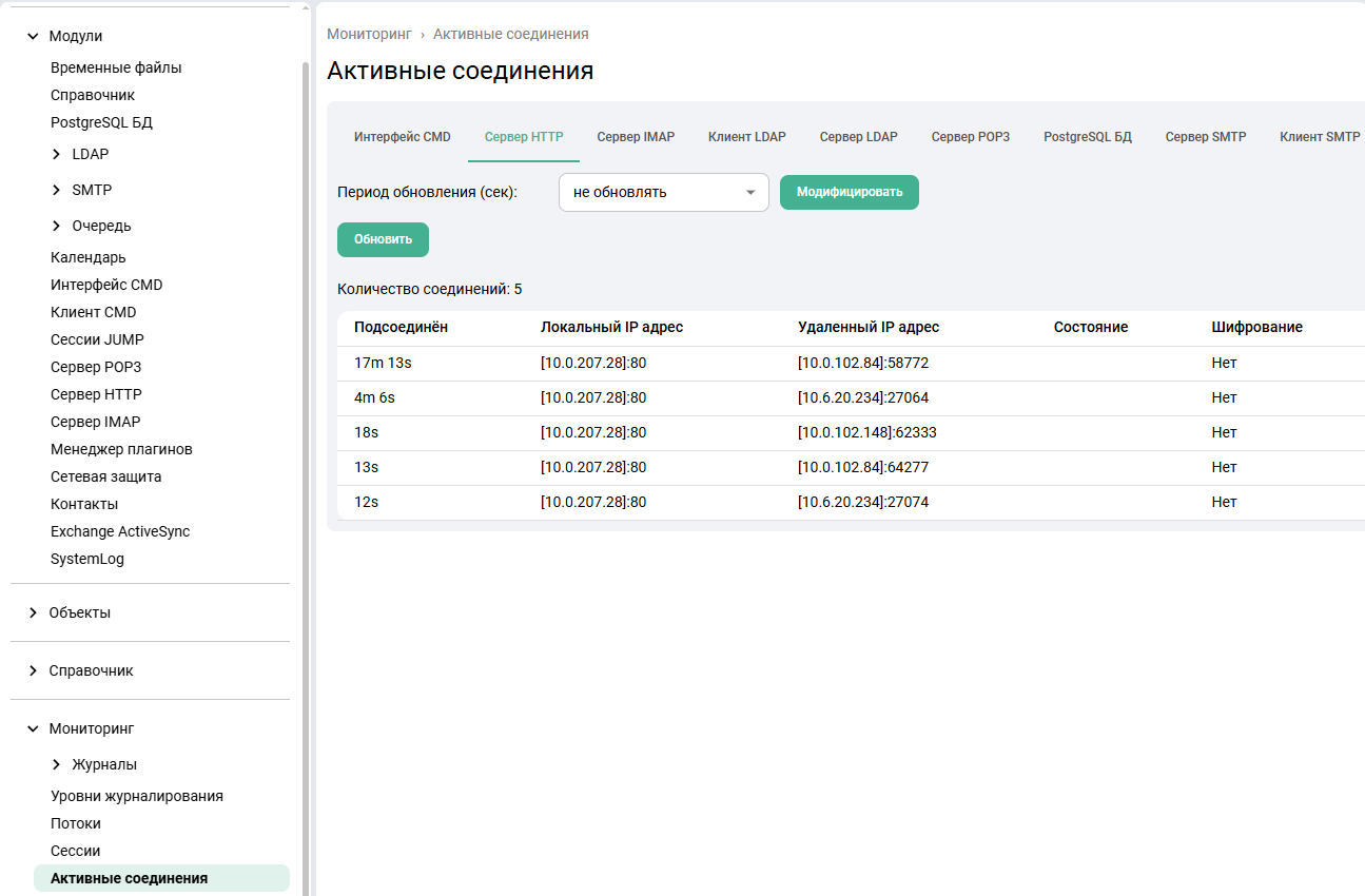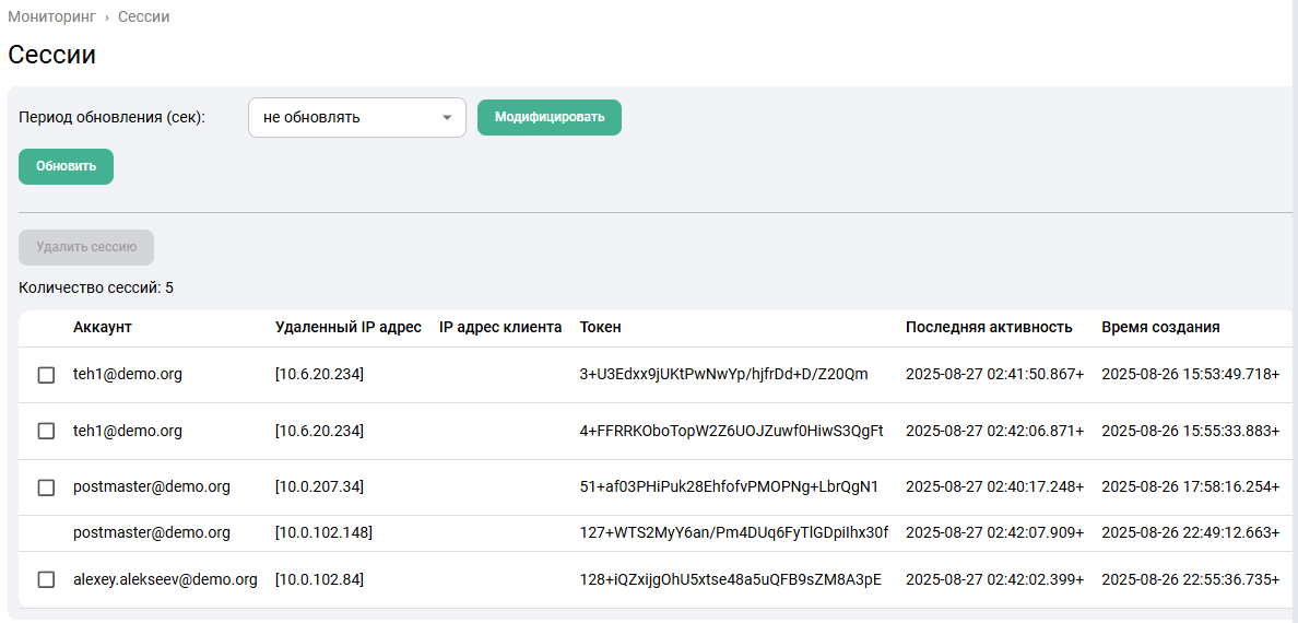 Вы можете установить периодичность автоматического обновления списка сессий, для этого напротив Период обновления (сек.) выберите нужное значение в секундах и нажмите Модифицировать.