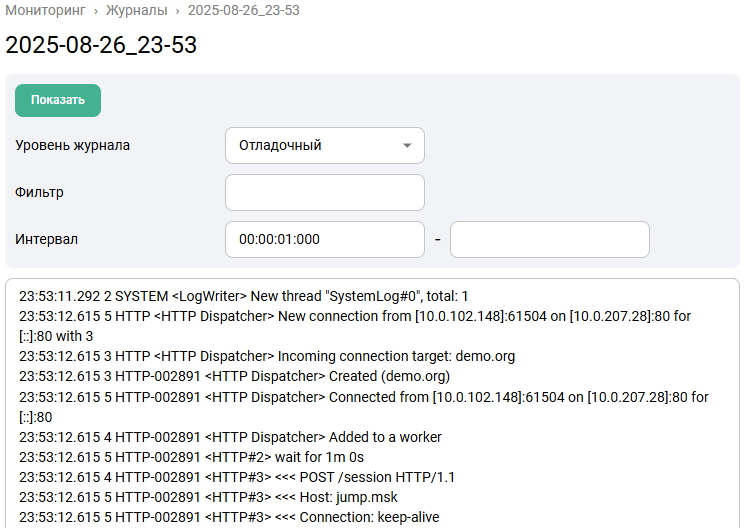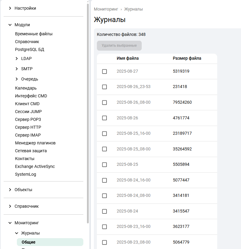 Страница Журналы содержит файлы журналов событий сервера. Чтобы просмотреть журналы событий, нужно перейти в раздел Мониторинг и выбрать Журналы.