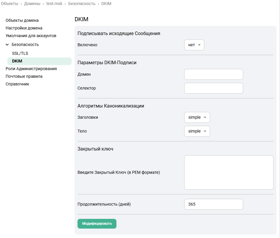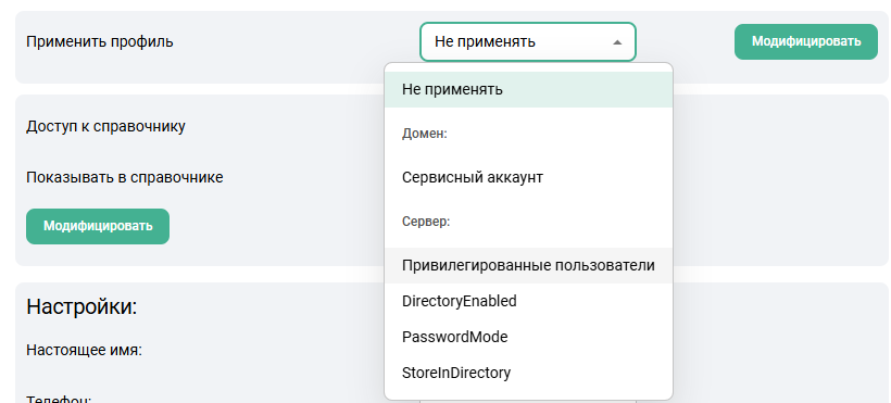 Настройка предоставляет аккаунту доступ к справочнику домена. Для этого ее необходимо включить, выбрав из выпадающего меню да и нажать Модифицировать. -
