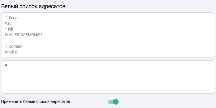 Чтобы активировать белый список адресатов, в настройках почты аккаунта нужно включить опцию Примерять белый список адресатов. После этого E-mail адреса, не попадающие под шаблоны, будут отвергаться сервером.
