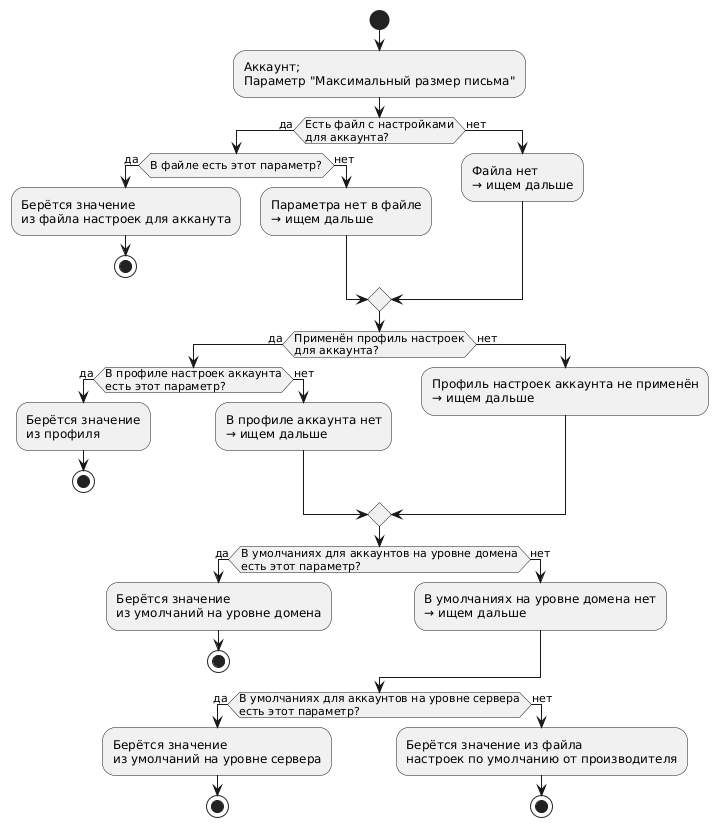если на уровне аккаунта значение размера письма задано По умолчанию, а на уровне домена в умолчаниях для аккаунтов задано значение 20 МБ, то автоматически для аккаунта значением станет По умолчанию (20 МБ);