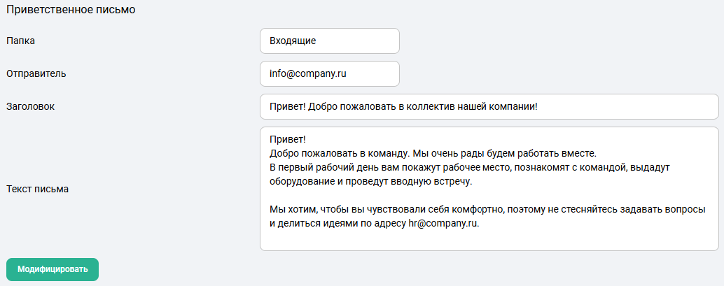 Информация из карточки аккаунта отображается в адресной книге для просмотра пользователями почты. Чтобы задать данные о пользователе аккаунта, нужно перейти в установки аккаунта и ввести необходимую информацию в пустые поля. После этого нажать Модифицировать, чтобы сохранить настройки.Карточка аккаунта содержит:
