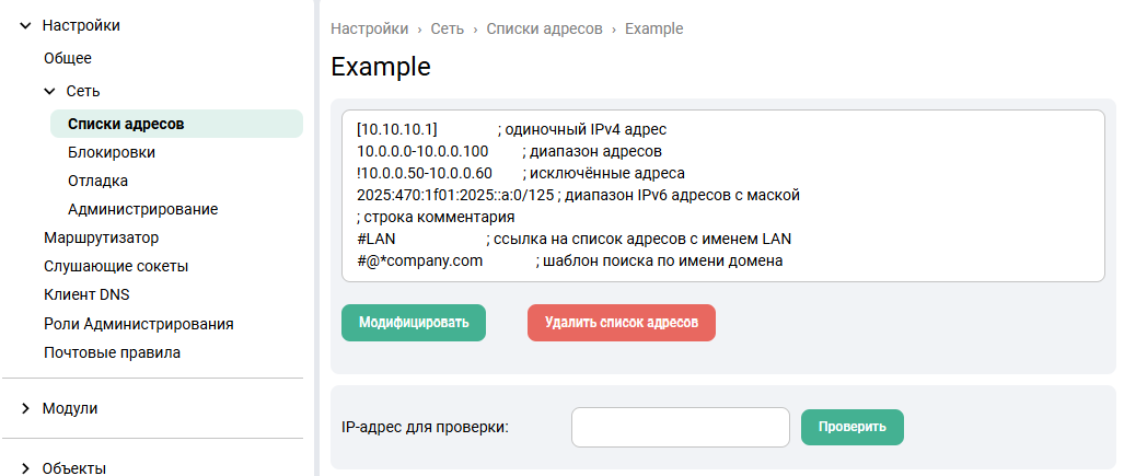 В поле IP-адрес для проверки можно ввести IP-адрес для проверки наличия или отсутствия этого адреса в текущем списке адресов. После ввода IP-адреса нажмите Проверить.