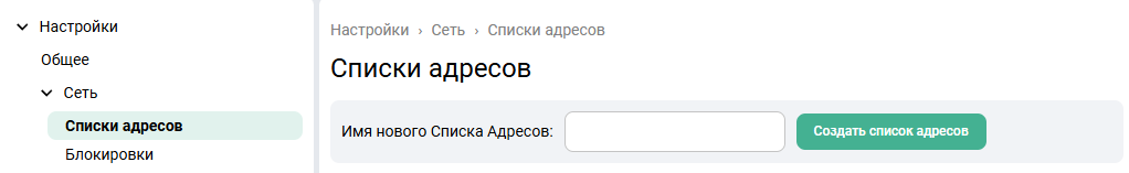 На странице Сеть можно указать именованные списки IP-адресов, адреса для блокировки, неблокируемые адреса, адреса под отладкой и адреса администраторов.