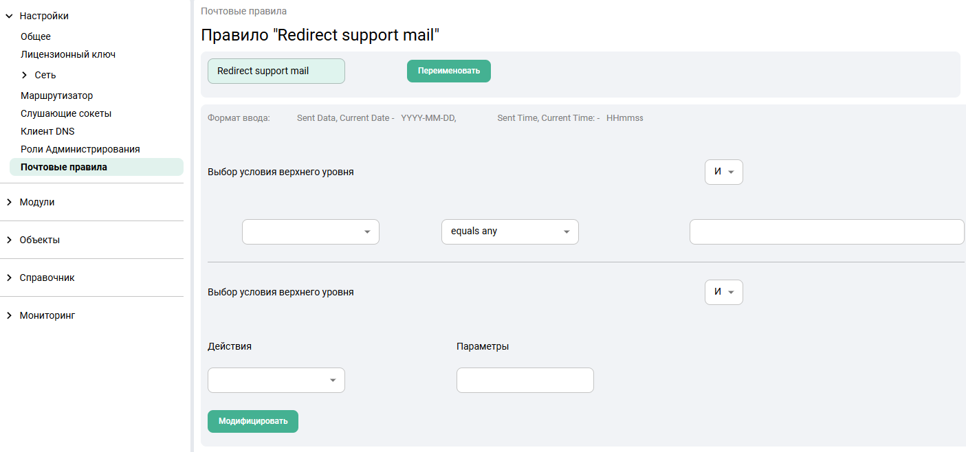 В верхней части указывается имя правила (например, Redirect support mail). Рекомендуется использовать имена, отражающие значение правила.