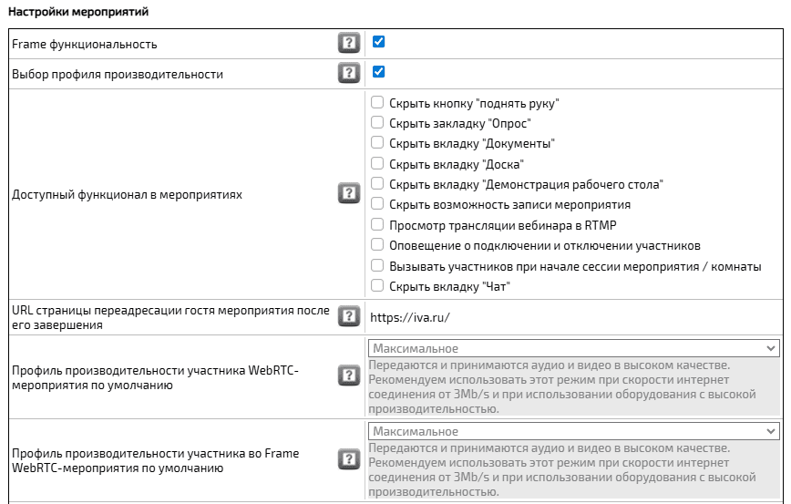 Настройки мероприятий могут выполняться как в доменных, так и в системных настройках Платформы IVA MCU.