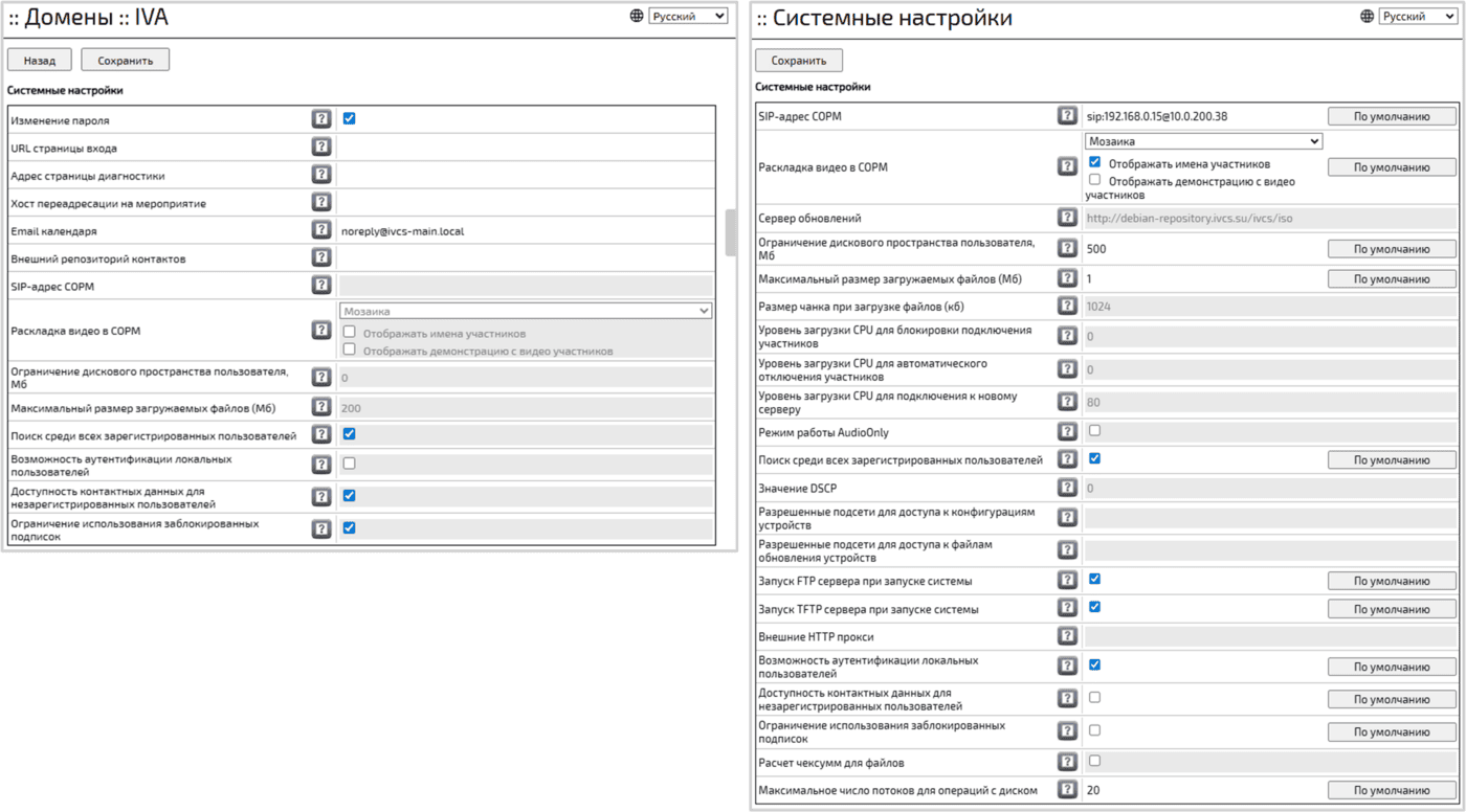 В секции Системные настройки доступны следующие системные / доменные настройки Платформы IVA MCU: