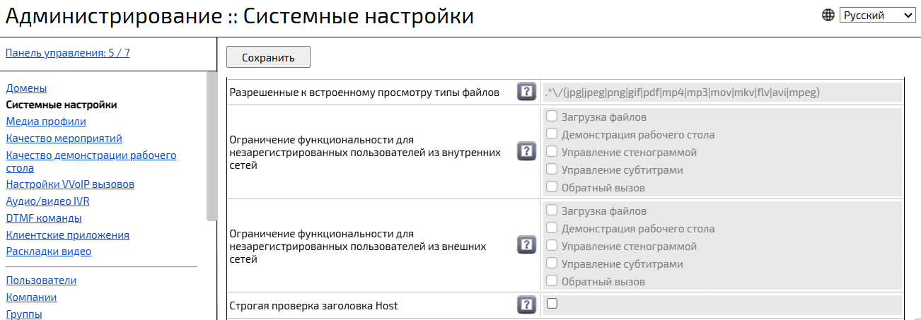Настройки безопасности → Поле Считать контент VVoIP-участников внешним → Включить флаговую кнопку (при необходимости) -