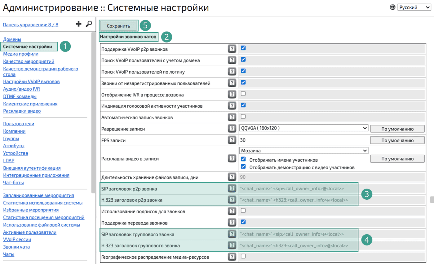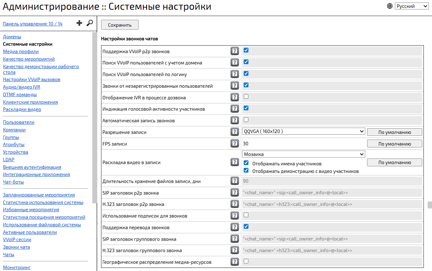 Администратор Платформы IVA MCU в разделе доменных / системных настроек может выполнить следующие настройки звонков чатов: