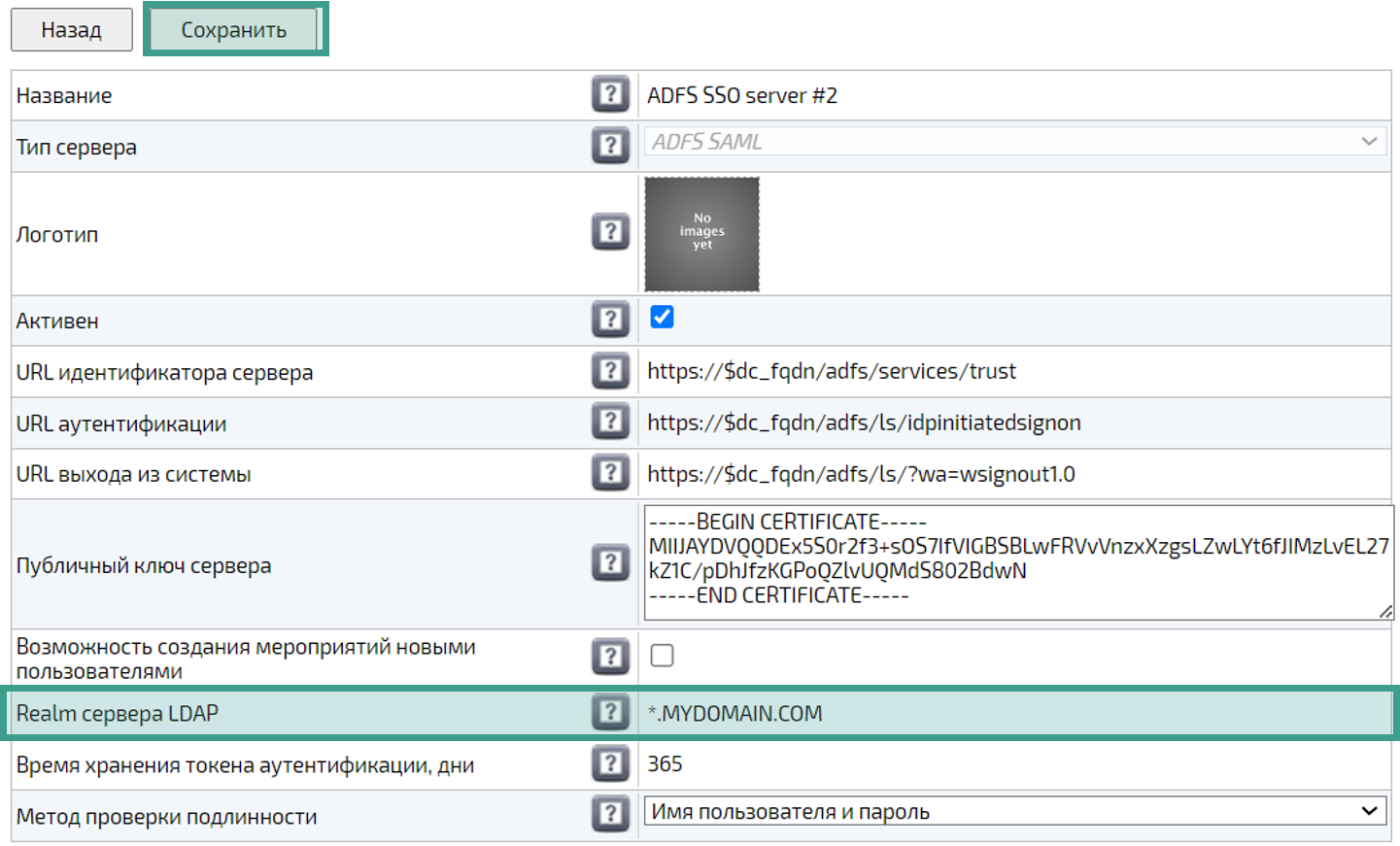 Realm сервера LDAP заполняется для реализации авторизации через ADFS с одновременным получением данных из LDAP: