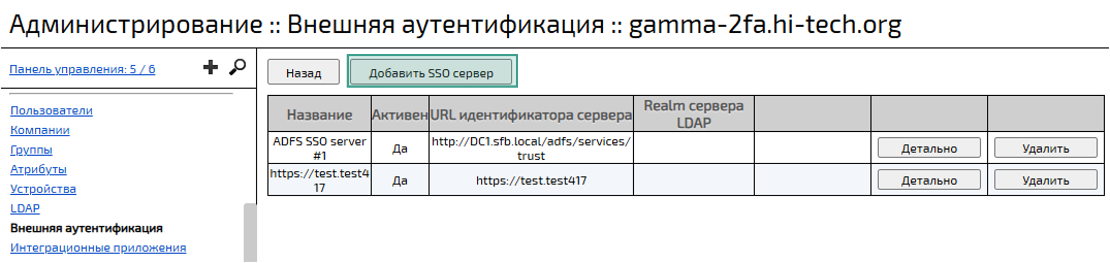 SSO-сервера → Нажать кнопку Добавить SSO сервер