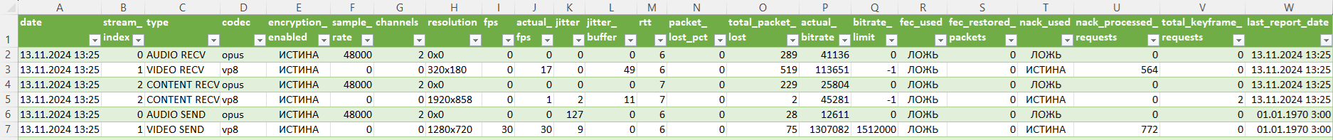 В разделе Статистика соединения при просмотре или экспорте статистики соединения отображается следующая информация: