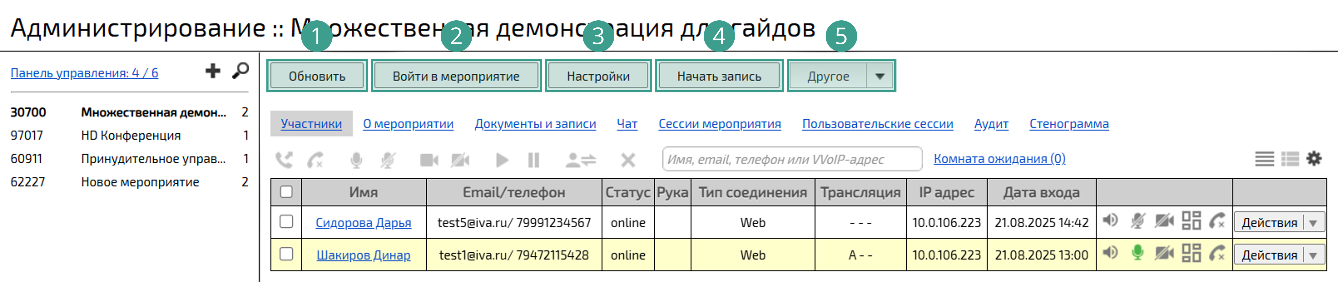 Чтобы перейти к панели управления мероприятием Администратору Платформы IVA MCU, необходимо: