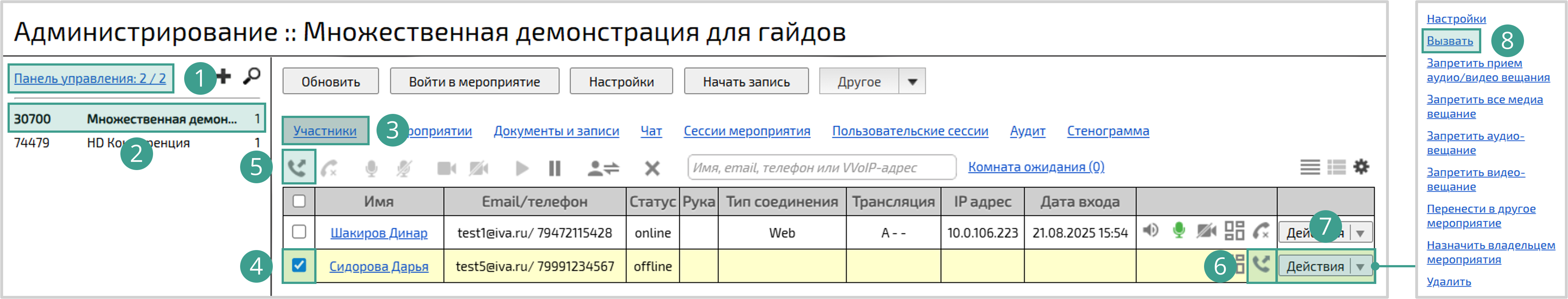 Чтобы вызвать участника со статусом offline в мероприятие, необходимо: