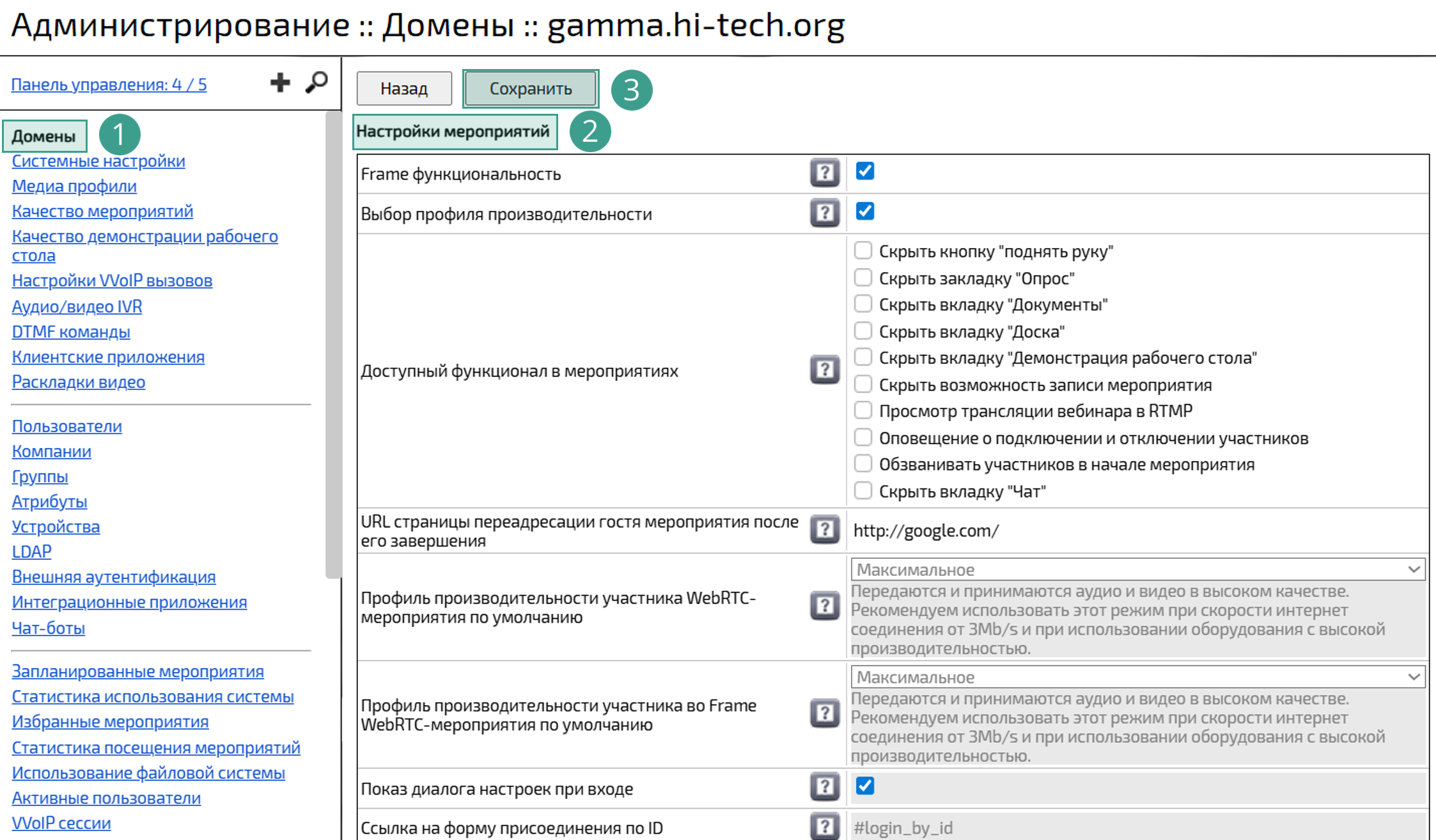 В секции Настройки мероприятий раздела Доменных настроек web-панели администрирования Платформы можно: