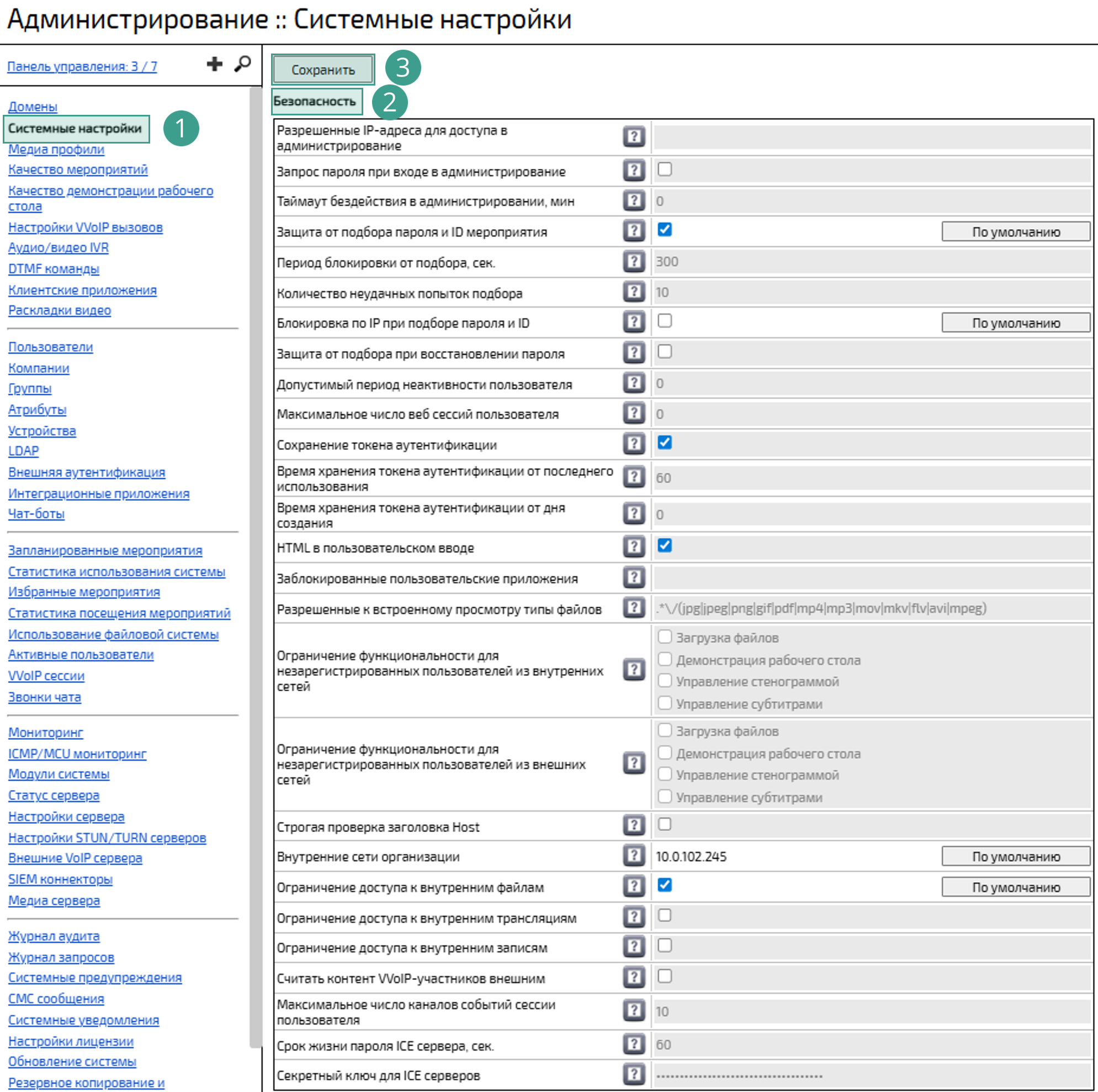 В секции Безопасность раздела Системные настройки web-панели администрирования Платформы можно: