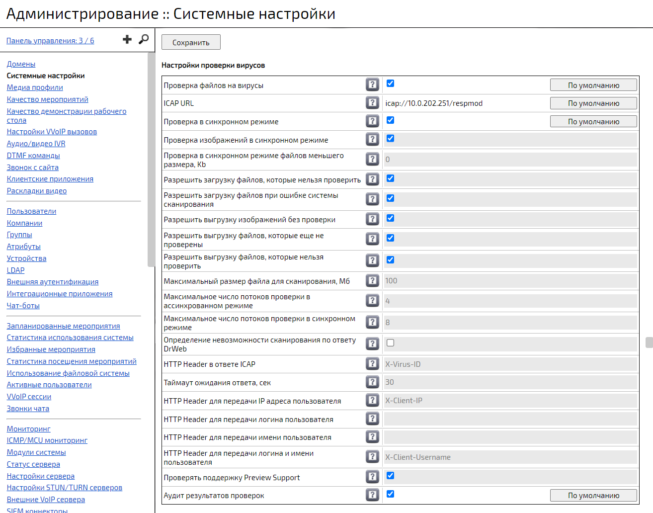 Для обеспечения дополнительной защиты пользователей при обмене файлами в Платформе IVA MCU доступна возможность проверки загружаемых на сервер файлов на вирусы по протоколу ICAP.