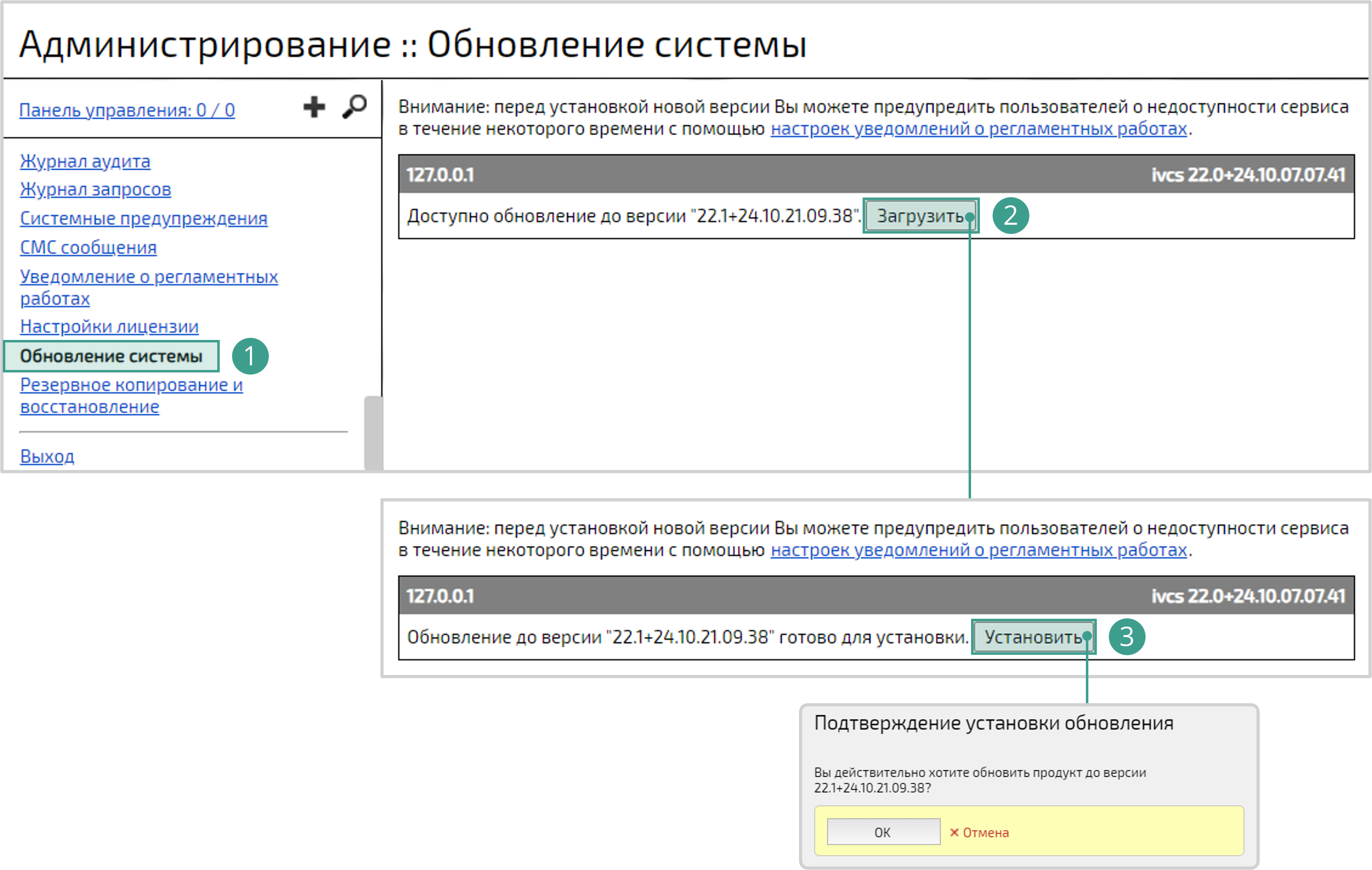 Войти в web-панель администрирования → Перейти в раздел Обновление системы