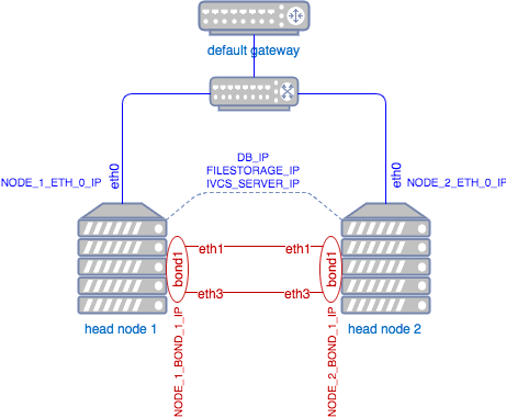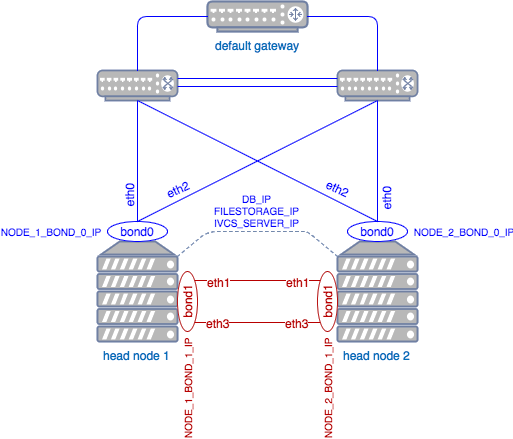Оба сервера из состава кластера имеют по четыре сетевых интерфейса. Интерфейсы eth0 и eth2, объединенные по технологии Linux Ethernet Bonding, используются для подключения Платформы IVA MCU к сети заказчика и подключены к разным коммутаторам. Через эти интерфейсы осуществляется доступ пользователей к Платформе, а также удаленное управление решением со стороны системных администраторов и обслуживающего персонала. Также эти два интерфейса используются программным обеспечением Pacemaker для проверки доступности узлов кластера, обмена информацией о состоянии узлов и ресурсов, работающих под управлением кластера.