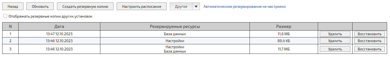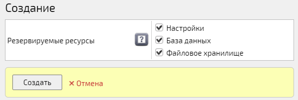 Управление резервными копиями → Нажать кнопку Создать резервную копию → Создание → Выбрать резервируемые ресурсы: Настройки, База данных (если используется локальная база данных), Файловое хранилище (если используется внешнее файловое хранилище, то для создания резервной копии рекомендуется использовать внешние средства) → Нажать кнопку Создать