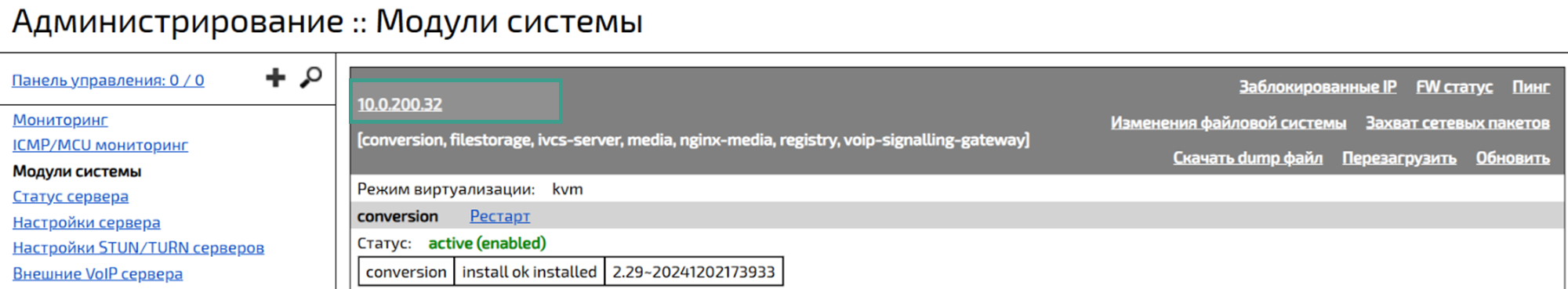 Войти в web-панель администрирования → Перейти в раздел Модули системы → Выбрать сервер управления и убедиться, что указан верный IP-адрес головного сервера управления