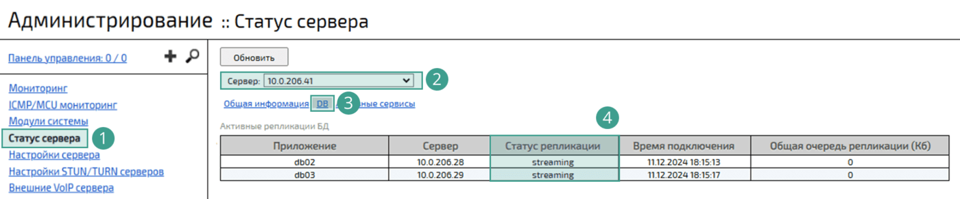 в web-панели администрирования посмотреть статус репликации кластера внешней СУБД: