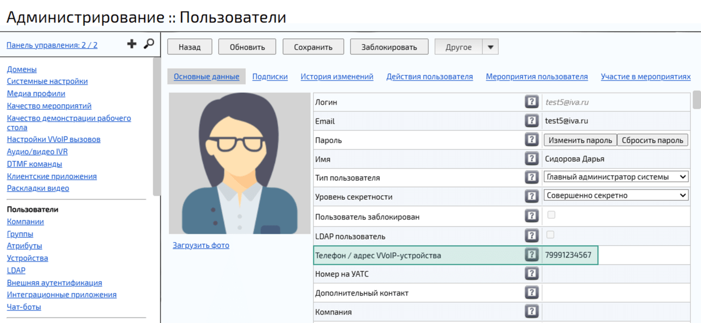в профиле пользователя указать Телефон / адрес VVoIP-устройства пользователя Платформы IVA MCU для IP АТС: