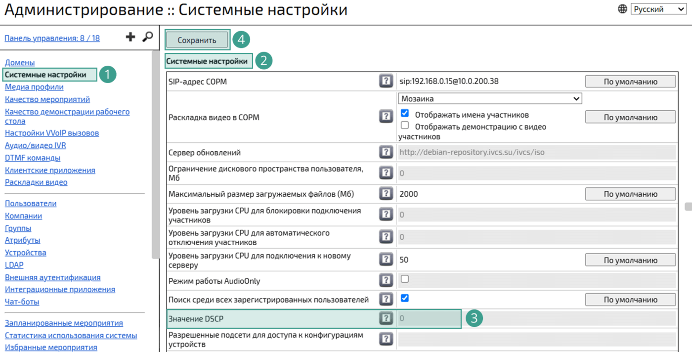 Маркировка медиатрафика обеспечивает QoS путем приоритизации и резервирования ресурсов полосы пропускания для пакетов IVA MCU со стороны сетевого оборудования заказчика.