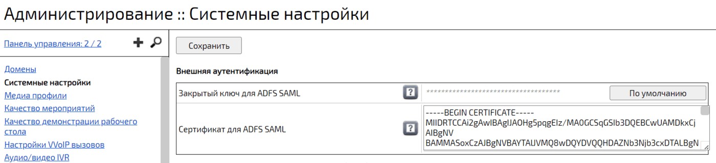 Войти в web-панель администрирования → Перейти в раздел Системные настройки → Выбрать секцию Внешняя аутентификация → Поле Закрытый ключ для ADFS SAML → Ввести данные → Поле Сертификат для ADFS SAML → Ввести данные -