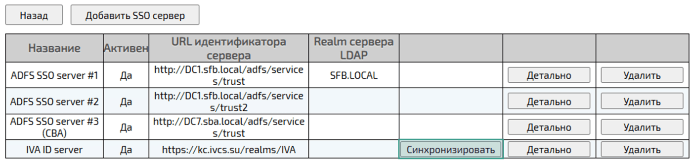 Перейти к настройке SSO сервера → SSO сервер → Нажать кнопку СинхронизироватьВо время синхронизации выполняется создание и обновление пользователей Платформы IVA MCU, созданных на внешнем сервере аутентификации.