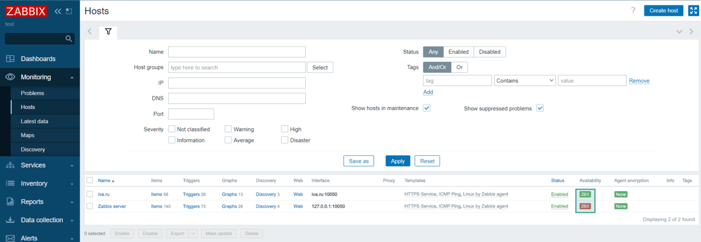 4. в случае красного цвета ячейки ZBX <Название хоста> убедиться, что порт 10050 TCP открыт с двух сторон: