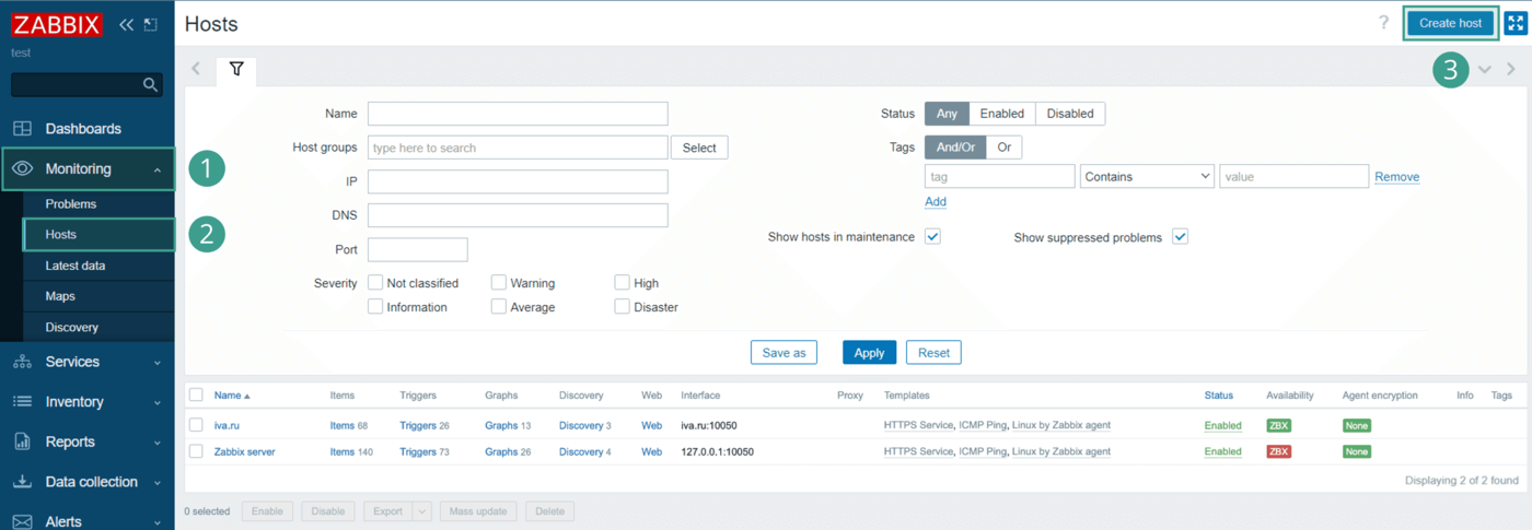Перейти к разделу Monitoring ball 1Открыть вкладку Hosts ball 2Нажать кнопку Create host ball 3New host